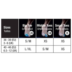 | Tailles | Gros orteil | Orteils moyens | Petits orteils |